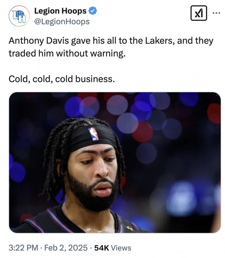 對(duì)此,美媒發(fā)推表示:“濃眉把一切都獻(xiàn)給了湖人,但他們卻毫無征兆地把他交易了。這筆交易太讓人心寒?!?/span>