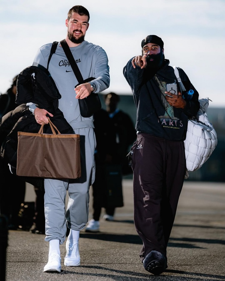快船眾將登機??哈登神仙指路 萊昂納德衛(wèi)衣+外套裹得嚴實