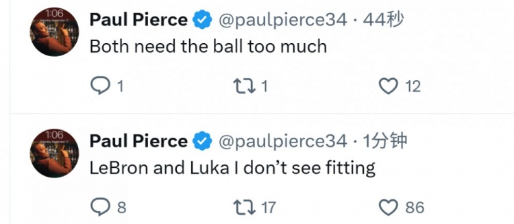 名宿皮爾斯發(fā)推寫道:“我認(rèn)為詹姆斯和東契奇不合適,他倆都需要大量持球?!?/p>