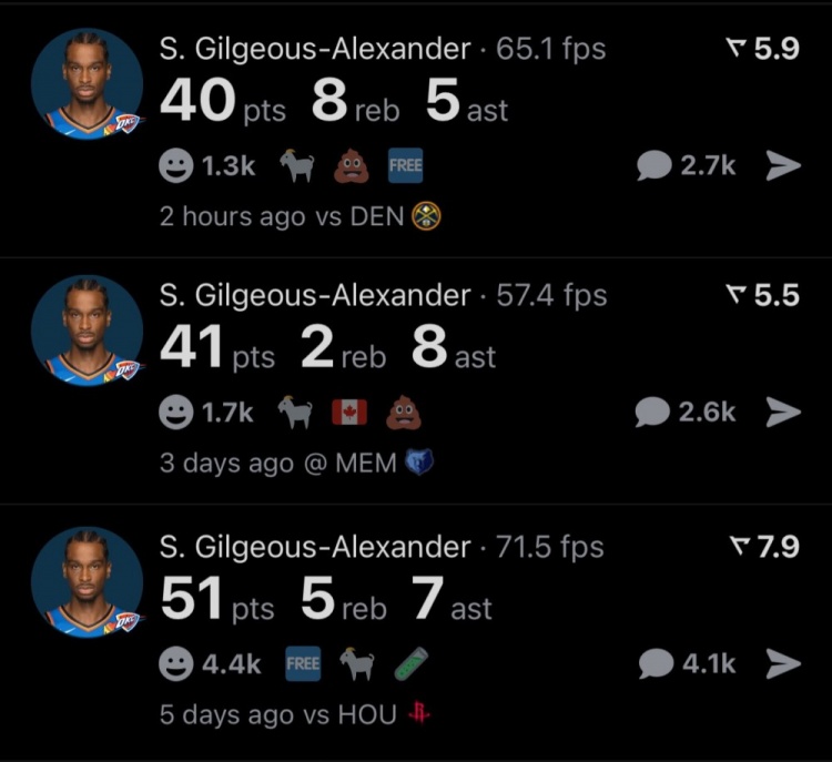 這樣以來,亞歷山大已經(jīng)連續(xù)3場比賽砍下40+,雷霆隊史繼威少后第二人!