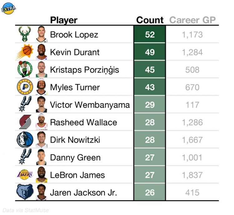 大洛第52次3+帽3+三分 歷史第1 文班僅用117場就29次 位列第5