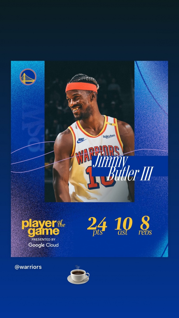 賽后,勇士官方評(píng)選巴特勒為本場(chǎng)最佳球員。庫里轉(zhuǎn)發(fā)并配上咖啡表情“??”