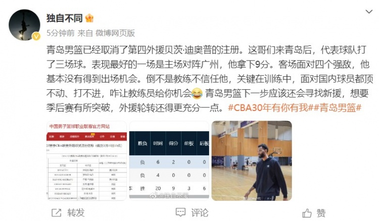 出戰(zhàn)3場(chǎng)&場(chǎng)均3.7分3板1.7助 CBA官方:青島男籃取消注冊(cè)迪奧普