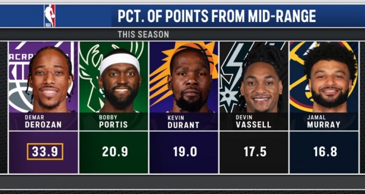 經典永不過時!本賽季中距離得分占比德羅贊33.9%第一&杜蘭特第三