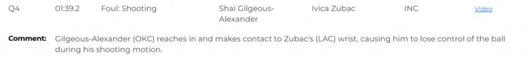 比賽最后1:39,快船落后99-100落后1分,亞歷山大(雷霆)伸手接觸到祖巴茨(快船)的手腕,導致他在投籃動作中失去對球的控制。
