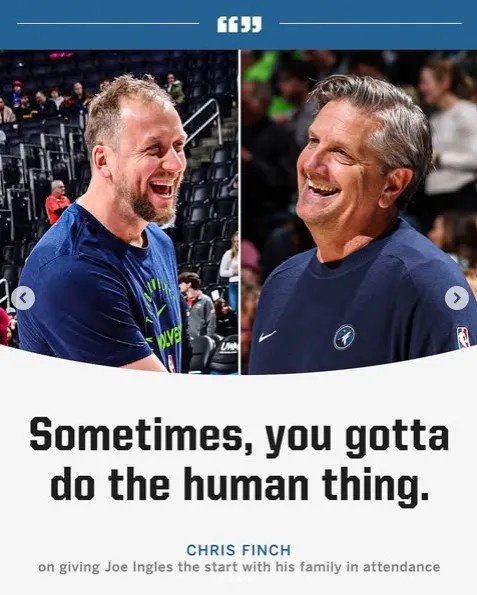 事實(shí)上芬奇也是當(dāng)天早上才決定這樣做的。有人跟他說,如果森林狼能夠在今晚的比賽中取得大比分領(lǐng)先,在大局已定的情況下讓英格爾斯上場(chǎng)會(huì)顯得很酷,既是對(duì)英格爾斯和他兒子的鼓勵(lì),也有助于凝聚球隊(duì)的士氣。