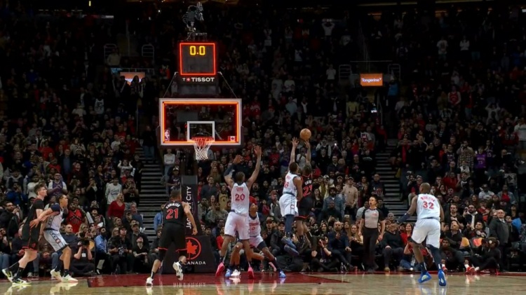奇才隊(duì)垂頭喪氣地站在一旁,希望裁判的審查能取消這個(gè)進(jìn)球。當(dāng)裁判做出裁決——謝德在時(shí)鐘指向0:00時(shí)仍有兩個(gè)手指觸球——奇才隊(duì)高興地跳了起來(lái),猛龍隊(duì)從興奮變?yōu)檎痼@,噪音從喧鬧變?yōu)槔Щ蟮牡驼Z(yǔ)。