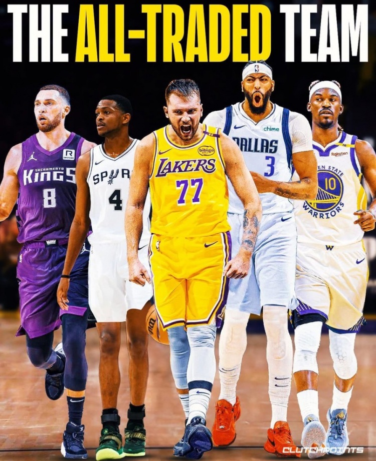 目前被交易的球星組隊(duì)首發(fā):東契奇、濃眉、??怂?、拉文、巴特勒替補(bǔ):英格拉姆、維金斯、庫茲馬、瓦蘭、馬克-威廉姆斯 標(biāo)簽: NBA 籃球 湖人 戴維斯 獨(dú)行俠 東契奇 勇士 巴特勒 國王 馬刺