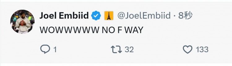 恩比德發(fā)推寫道:“哇哦.... 臥槽不會(huì)吧?!?/p>