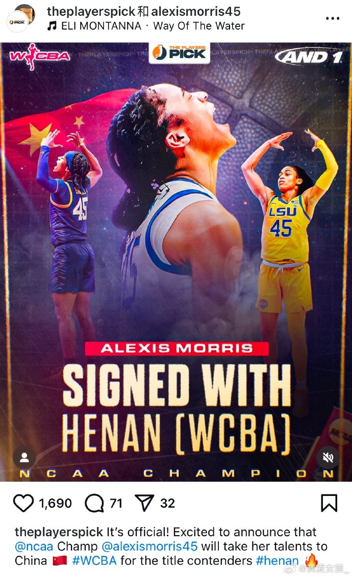 昨天深夜,據(jù)經(jīng)紀(jì)公司ThePlayersPick消息,原路易斯安那州立大學(xué)女籃后衛(wèi)艾里克西斯-莫里斯簽約河南女籃。艾里克西斯身高1米75,今年25歲,曾隨路易斯安那州立大學(xué)女籃奪得2023年NCAA全國(guó)冠軍。2023年WNBA選秀總第22順位被康涅狄格太陽隊(duì)選中。
