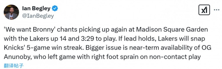據(jù)尼克斯隊(duì)記Ian Begley報(bào)道,比賽第四節(jié)末段,尼克斯主場(chǎng)球迷喊起了“我們要布朗尼”。