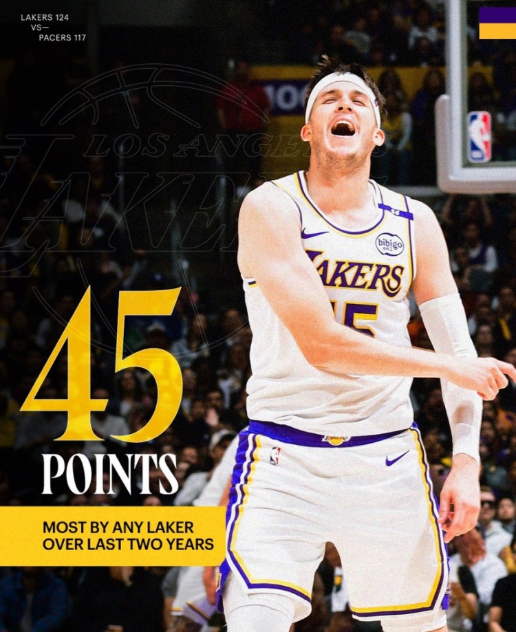 而上次有湖人球員單場砍45+要追溯到2023年1月25日,當時詹姆斯得到46分。