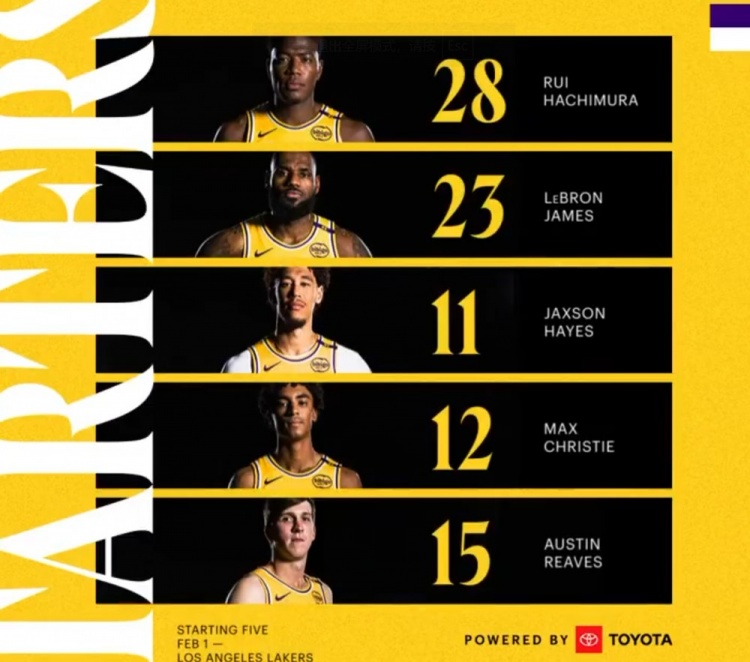 湖人首發(fā):里夫斯、克里斯蒂、八村塁、詹姆斯、海斯。