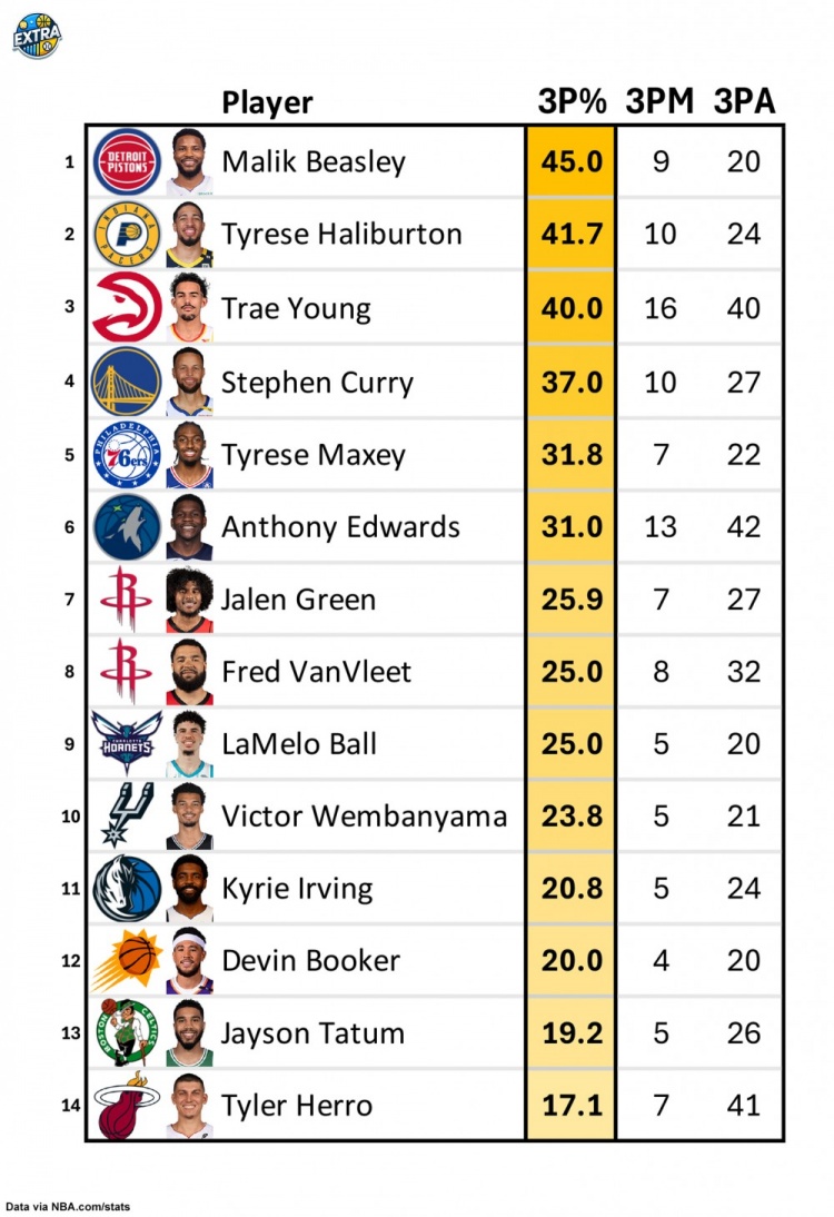 據(jù)統(tǒng)計(jì),本賽季共有14名球員在關(guān)鍵時(shí)刻(常規(guī)時(shí)間最后5分鐘或加時(shí)賽且分差不超過5分)出手了至少20記三分,這14人按命中率排名比斯利最準(zhǔn),庫里排第4,文班第10,具體如下圖:
