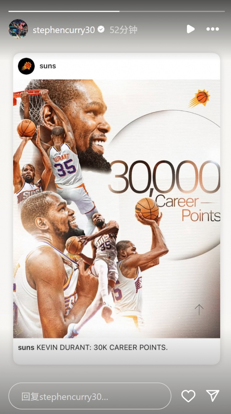 杜蘭特生涯總得分突破30000!庫(kù)里INS轉(zhuǎn)發(fā)相關(guān)動(dòng)態(tài)