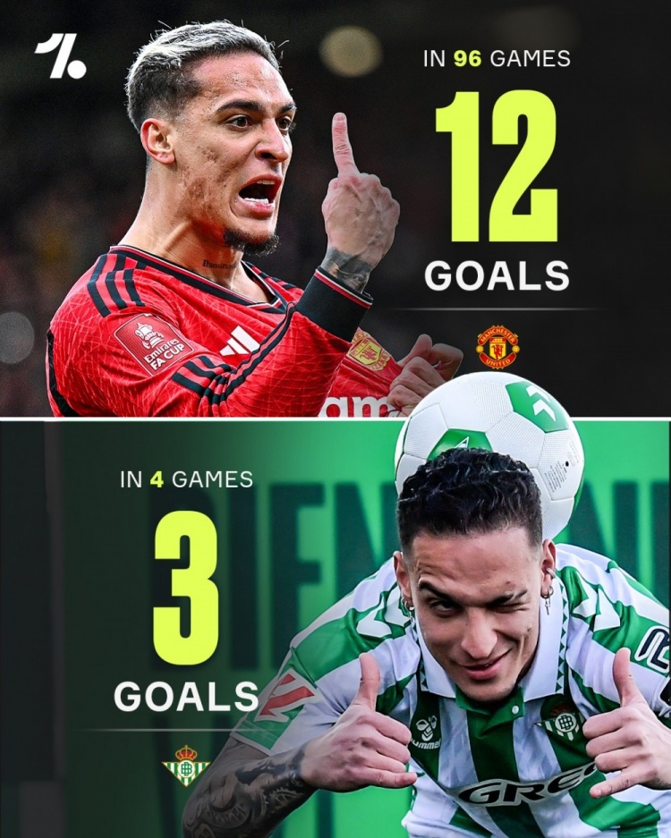 據(jù)OneFootball統(tǒng)計(jì),安東尼在曼聯(lián)出戰(zhàn)96場打進(jìn)12球,加盟貝蒂斯以來出戰(zhàn)4場比賽攻入3球,進(jìn)球效率顯著提高。