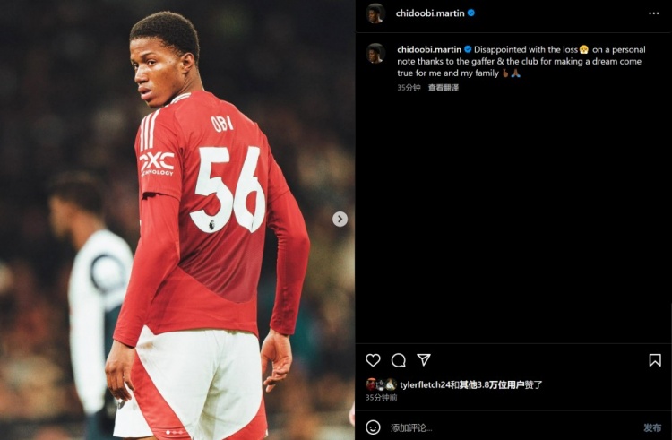 2月17日訊 英超本輪焦點戰(zhàn)中,曼聯(lián)0-1不敵熱刺。比賽尾聲階段,小將奧比-馬丁替補登場。賽后,他更新了社媒紀念自己的曼聯(lián)一線隊首秀。