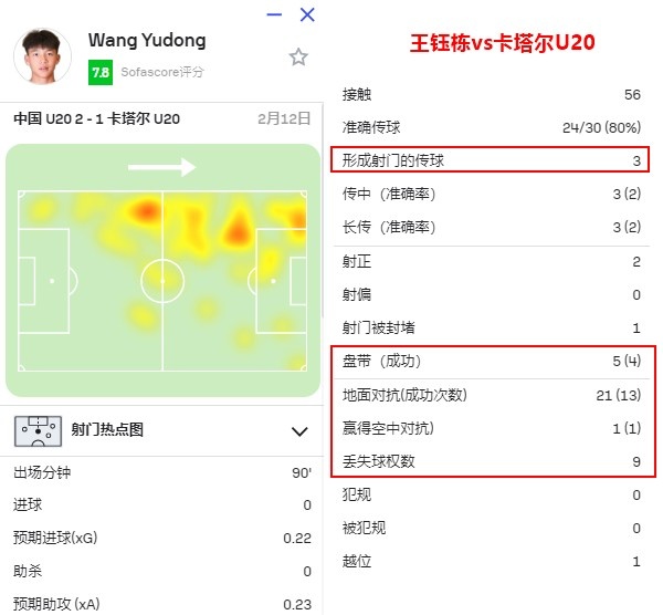 從對(duì)戰(zhàn)卡塔爾U20比賽中的數(shù)據(jù)可以看到,王鈺棟5次過(guò)人4次成功,22次一對(duì)一對(duì)抗贏下14次,送出3次帶來(lái)射門的關(guān)鍵傳球。
