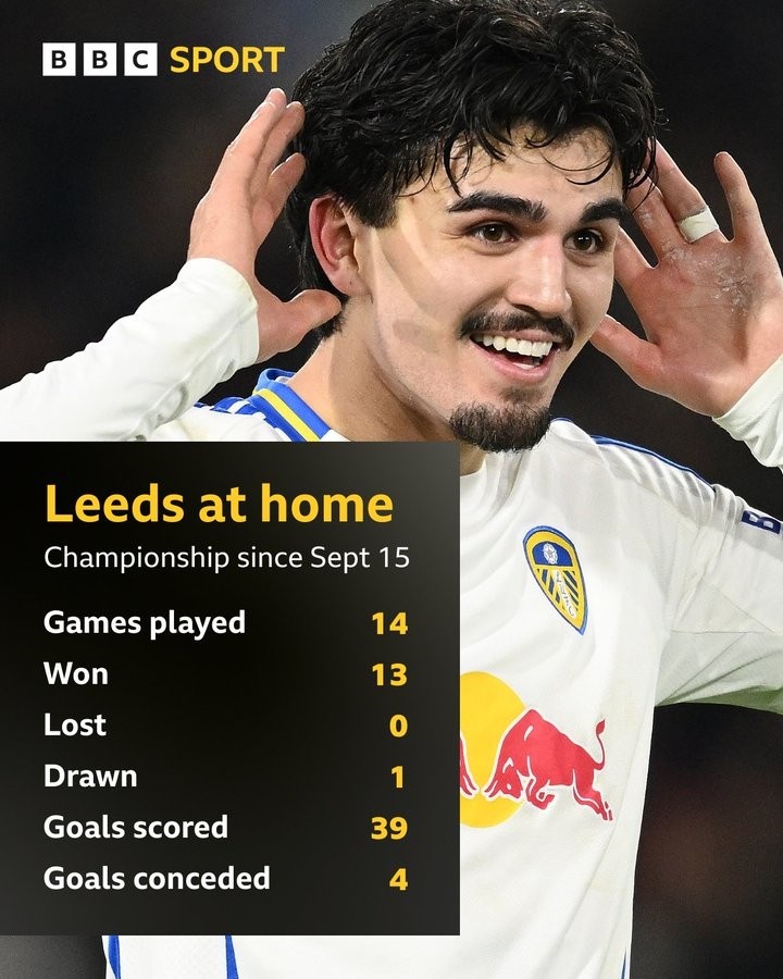 BBC統(tǒng)計表明,近14個英冠主場,利茲聯(lián)13勝1平保持不敗,期間狂轟39球只丟4球,沖超的勢頭似乎已經(jīng)無人能擋。