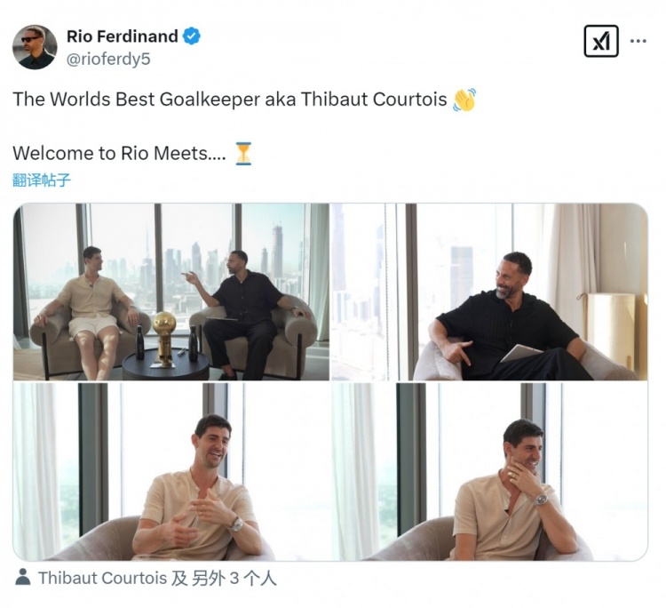 費迪南德對庫爾圖瓦進行了專訪,他在社交媒體上曬出照片,并配文:“世界最佳門將叫做庫爾圖瓦,歡迎來到Rio Meets節(jié)目?!?/p>