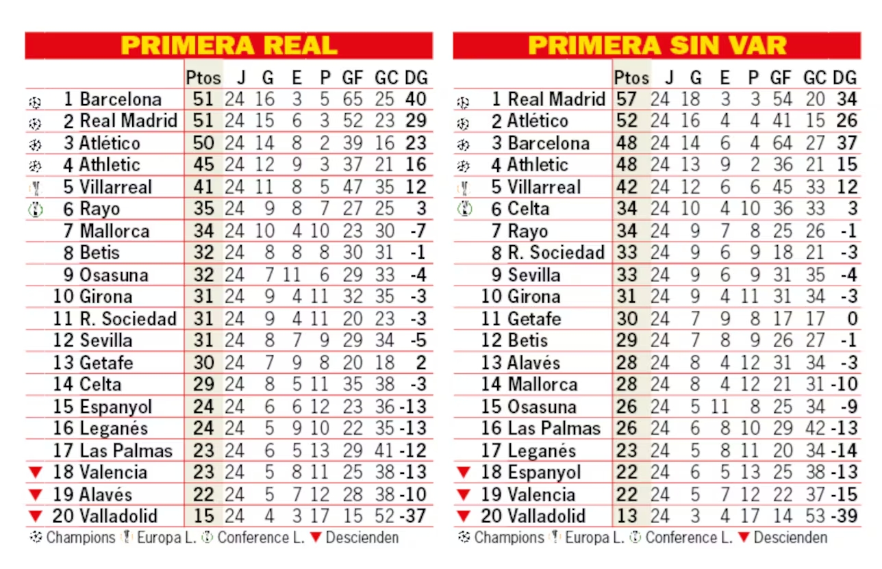 西媒《阿斯報》撰文提到,本賽季視頻助理裁判導(dǎo)致了積分榜形勢逆轉(zhuǎn),如果沒有VAR,皇馬則會以5分優(yōu)勢領(lǐng)跑積分榜,而巴薩會降至積分榜第三名,馬競排在第二位。
