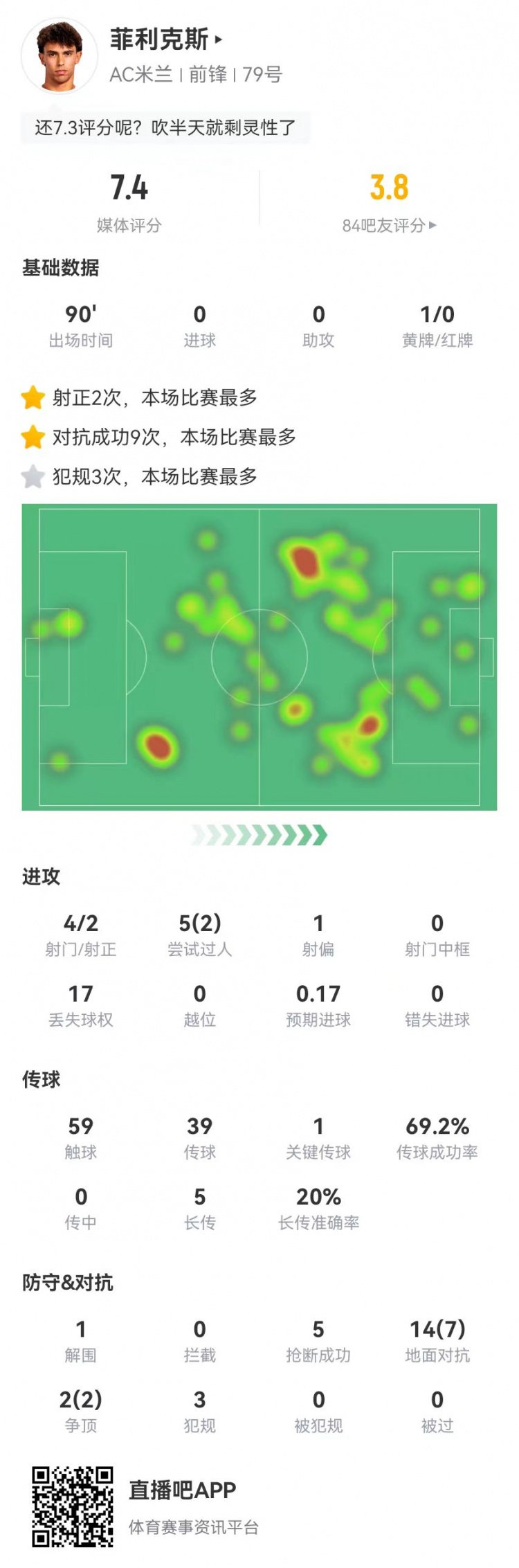 2月19日訊 米蘭在本輪歐冠1-1主場逼平費(fèi)耶諾德,菲利克斯本場數(shù)據(jù)如下: