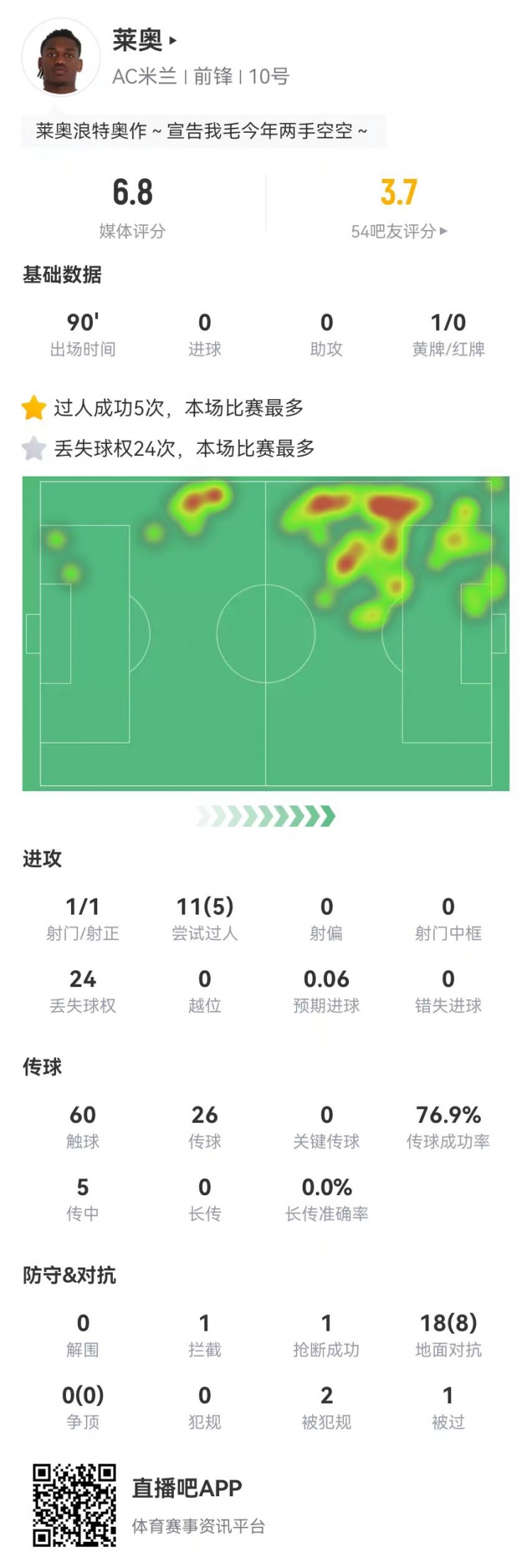 2月19日訊 米蘭在本輪歐冠主場被費耶諾德逼平,萊奧本場數(shù)據(jù)如下: