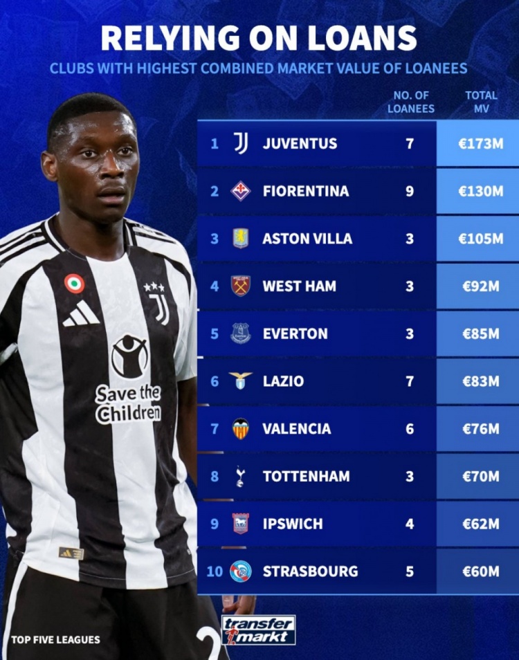 2月19日訊 德轉(zhuǎn)統(tǒng)計(jì)了歐洲5大聯(lián)賽球隊(duì)租借球員身價排行榜,其中,尤文租借了7名球員,總身價高達(dá)1.73億歐遙遙領(lǐng)先,佛羅倫薩和維拉排在二三位。