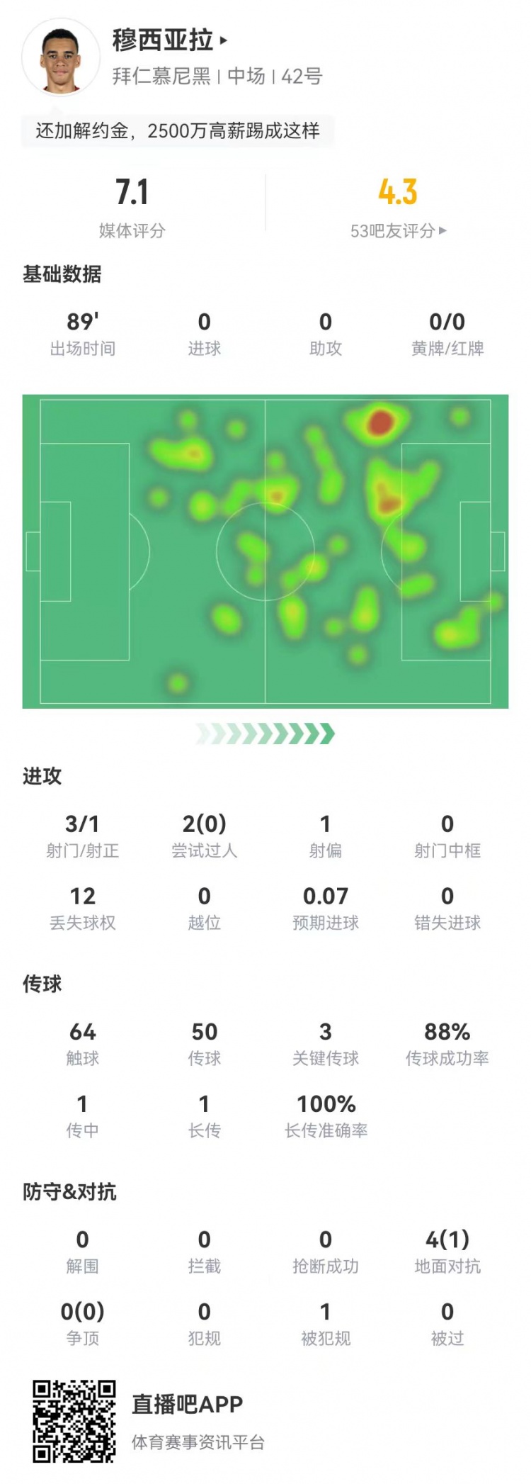 2月19日訊 拜仁在本輪歐冠1-1絕平凱爾特人,穆西亞拉本場(chǎng)數(shù)據(jù)如下:
