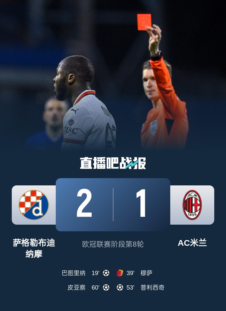 歐冠聯(lián)賽階段最后一輪,米蘭也是因?yàn)榧t牌葬送好局勢(shì)。米蘭原本取勝可直接晉級(jí)16強(qiáng),但穆薩上半場(chǎng)就兩黃被罰下,米蘭最終1-2不敵薩格勒布迪納摩,無(wú)緣前八。