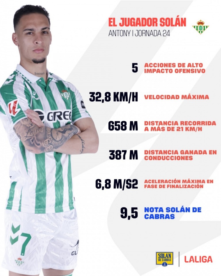 2月19日訊 西甲第24輪比賽,安東尼傳射+造點(diǎn),幫助貝蒂斯主場3-0擊敗皇家社會(huì)。西甲官方統(tǒng)計(jì)安東尼本場比賽的部分?jǐn)?shù)據(jù)。