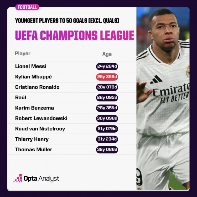 首回合對(duì)皇馬哈蘭德打進(jìn)兩球,將個(gè)人歐冠進(jìn)球數(shù)提升至49球,如果次回合哈蘭德再度攻破皇馬球門(mén),那他將以24歲213天的年齡,成為最快達(dá)成歐冠50球的球員。