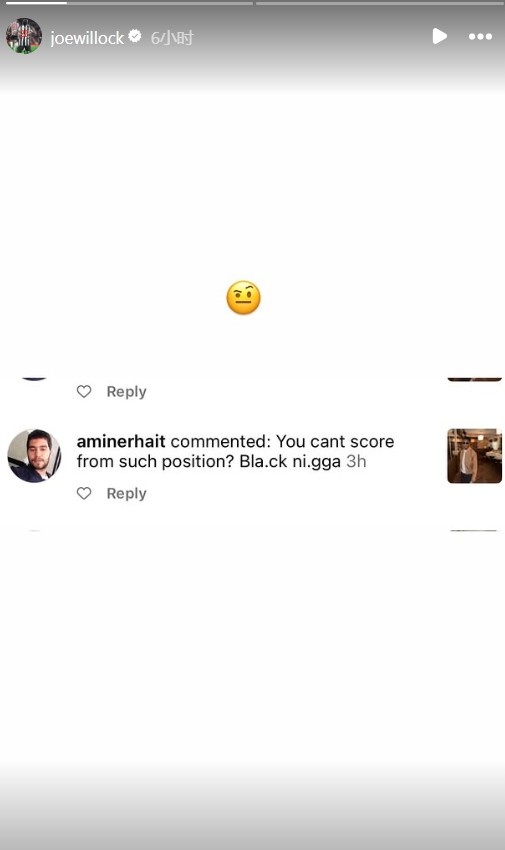 比賽結(jié)束后,威洛克在社媒上曬出了他在網(wǎng)上收到的種族主義辱罵的截圖。