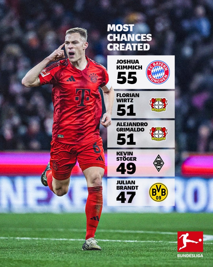 2月21日訊 德甲官方統(tǒng)計了本賽季球員創(chuàng)造機會的次數(shù),并列出榜單,基米希55次居首,維爾茨、格里馬爾多51次第二。