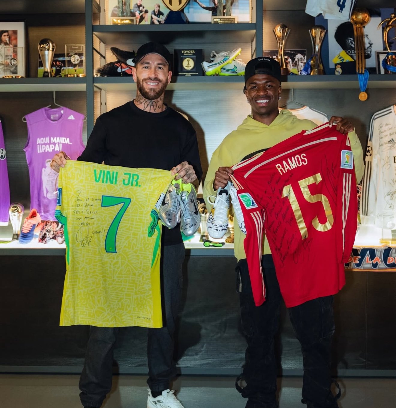 皇馬邊鋒維尼修斯也在近日拜訪了前輩拉莫斯的家,兩人交換國家隊球衣并合影留念。