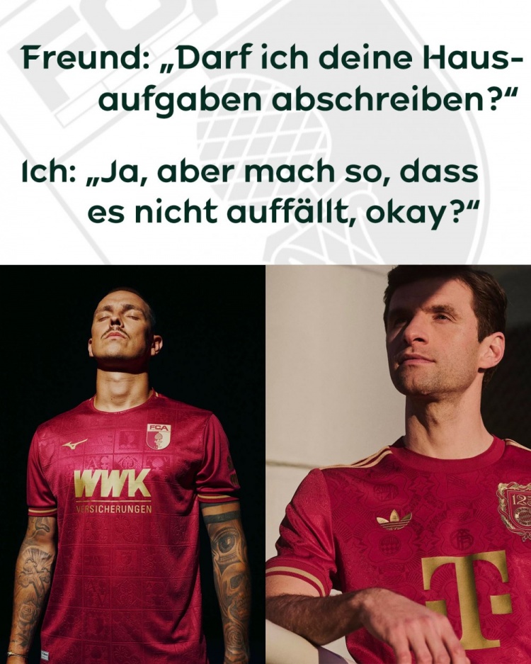 奧格斯堡還在對(duì)比圖上方有些幽默地配文道:“朋友:‘我可以抄你的家庭作業(yè)嗎?’我:‘可以,但要抄得不明顯一點(diǎn),好嗎?’”