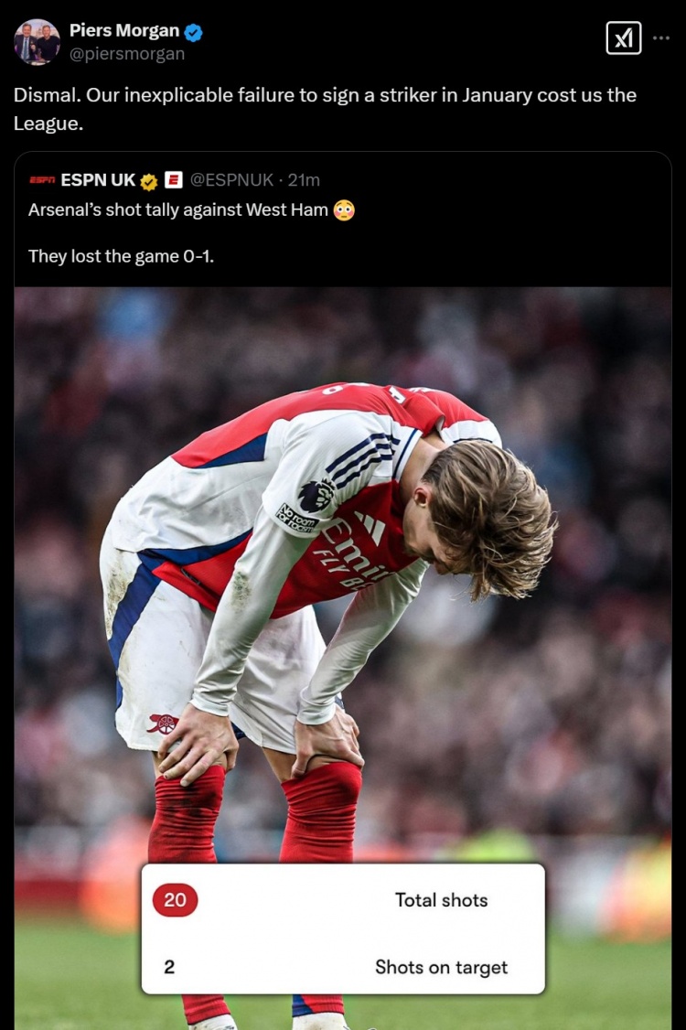 本場(chǎng)比賽,阿森納狂轟了20腳射門,但只有2次射正。摩根轉(zhuǎn)發(fā)了這一數(shù)據(jù),并寫道:太差勁了。我們一月份莫名其妙地沒(méi)能簽下一名前鋒,這導(dǎo)致我們丟掉了聯(lián)賽冠軍。