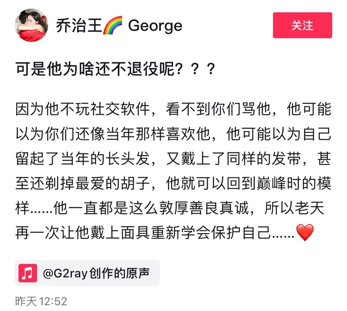 因為他不玩社交軟件,看不到你們罵他,他可能以為你們還像當年那樣喜歡他,他可能以為自己留起了當年的長頭發(fā),又戴上了同樣的發(fā)帶,甚至還剃掉最愛的胡子,他就可以回到巔峰時的模樣…… 他一直都是這么敦厚善良真誠,所以老天再一次讓他戴上面具重新學會保護自己……?