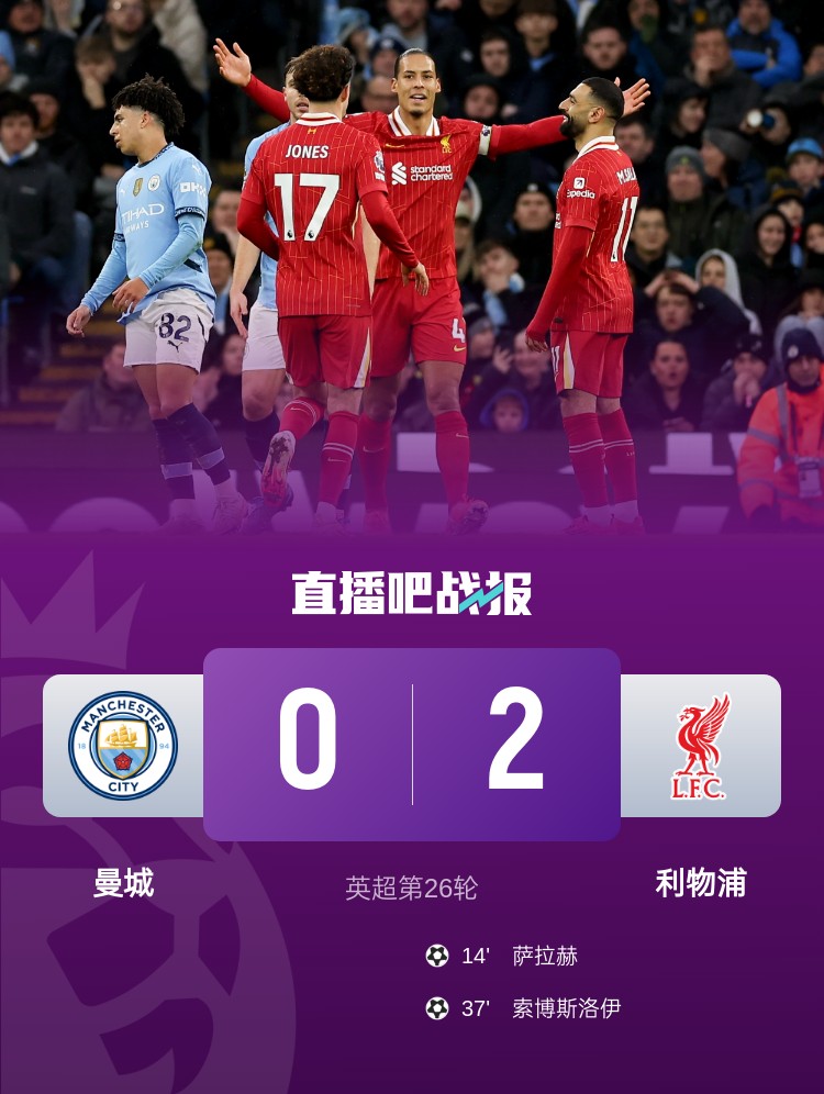 英超第26輪,利物浦2-0雙殺曼城。上半場,劉易斯失誤送角球致丟球,薩拉赫和索博斯洛伊互獻傳射,馬爾穆什進球越位;下半場,瓊斯進球越位在先。