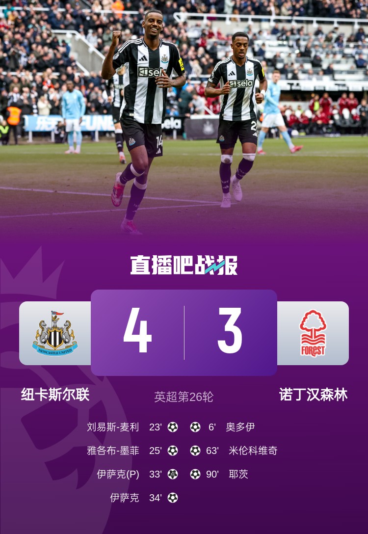 英超第26輪,紐卡4-3諾丁漢森林。上半場,奧多伊前場斷球后轟出世界波破門,麥利和墨菲3分鐘內連進兩球,埃納手球送點,伊薩克點射得手,隨后他梅開二度;下半場,沙爾頭球中柱,米倫科維奇蝎子擺尾扳回一球,耶茨補時階段再追一球。
