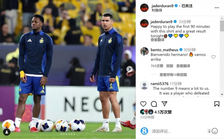 杜蘭在社交媒體上曬出與C羅的合照,并寫道:“很高興身穿這件球衣踢滿90分鐘,并在今晚取得很棒的結(jié)果。”