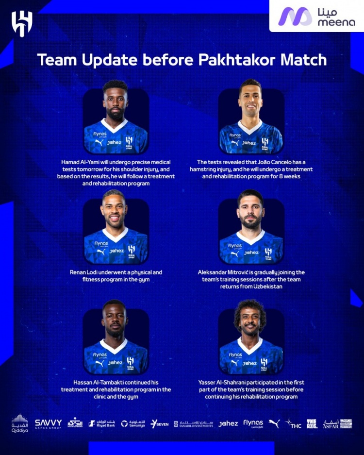 3月3日訊 利雅得新月官方更新了隊內(nèi)6位球員的最新傷病情況,其中坎塞洛腿筋受傷,預(yù)計傷停8周。