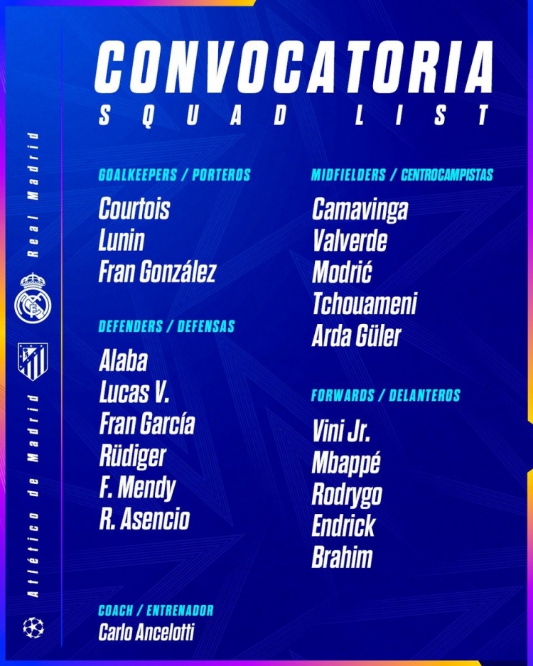 皇馬歐冠19人名單:姆巴佩領(lǐng)銜&貝林厄姆停賽,巴爾韋德火線復(fù)出