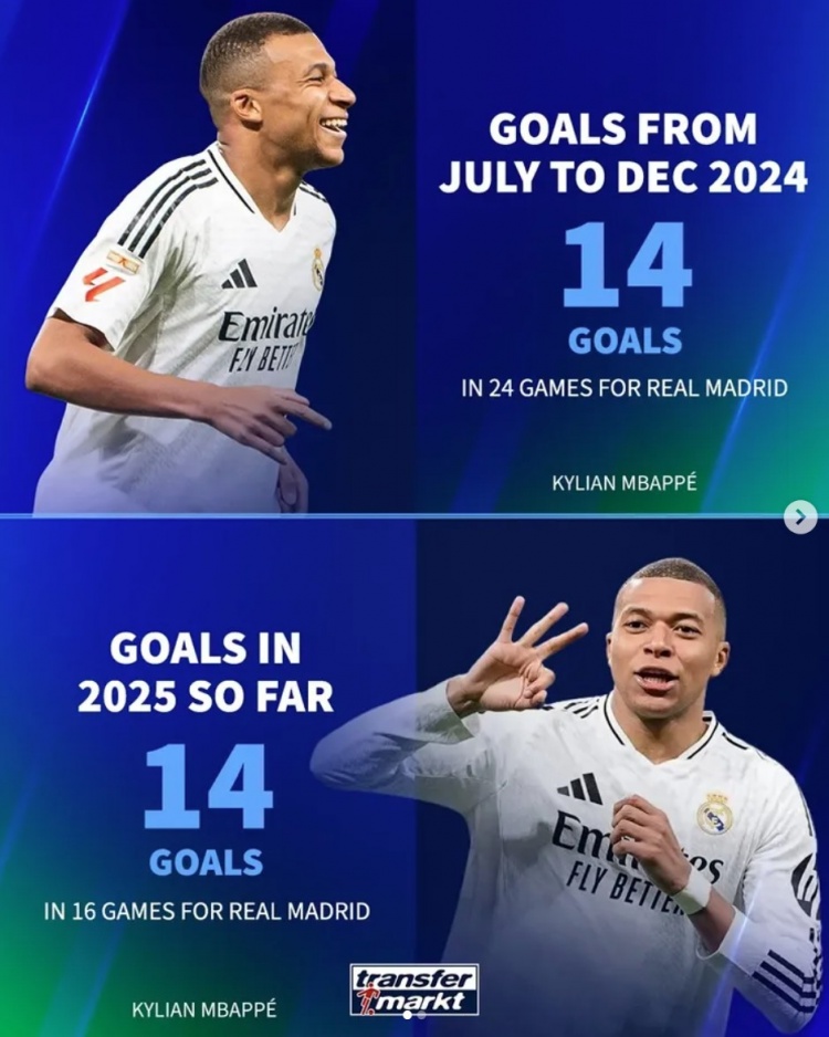 作為對(duì)比,姆巴佩在去年7月到12月共計(jì)24場(chǎng)打進(jìn)14球,而進(jìn)入2025年后16場(chǎng)也打進(jìn)14球。
