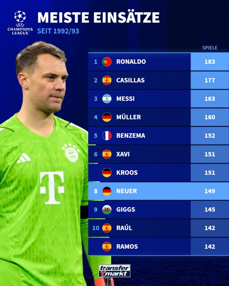 目前,諾伊爾是歐冠出場(chǎng)第三多的德國(guó)球員,也在歐冠歷史出場(chǎng)次數(shù)榜中排名第8。