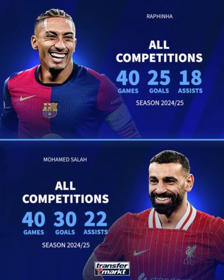 拉菲尼亞本賽季為巴薩各項賽事出戰(zhàn)40場,貢獻25球18助攻。