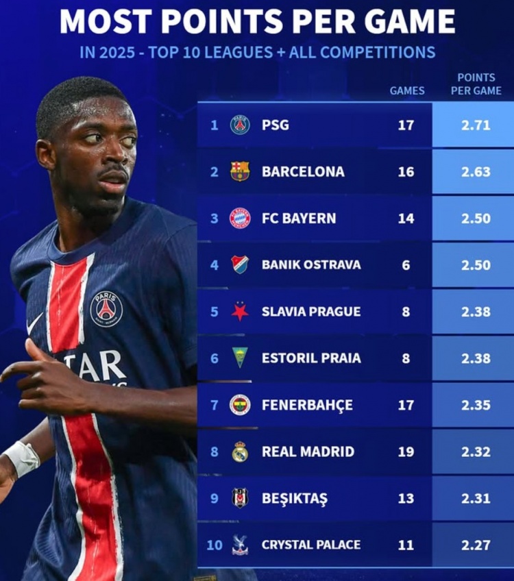 3月8日訊 《轉(zhuǎn)會(huì)市場(chǎng)》統(tǒng)計(jì)了歐足聯(lián)排名前十聯(lián)賽的球隊(duì)在2025年各項(xiàng)賽事場(chǎng)均拿分情況,巴黎領(lǐng)跑。