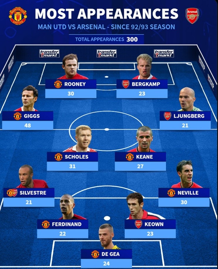 3月9日訊 本輪英超將迎來阿森納與曼聯(lián)的焦點之戰(zhàn),轉(zhuǎn)會市場也盤點了英超時代出戰(zhàn)曼聯(lián)vs阿森納比賽最多的球員陣容,吉格斯、魯尼、博格坎普等眾球星在列,具體陣容如下:
