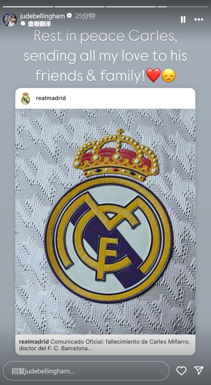 皇馬中場貝林厄姆更新社媒悼念卡萊斯,配文:“R.I.P.卡萊斯,向他的家人朋友致以我所有的愛。”