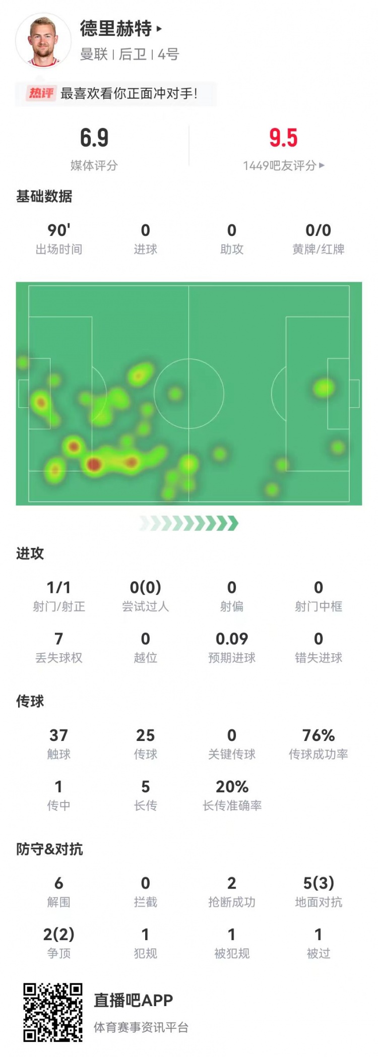 定海神針!德里赫特本場6解圍2搶斷 7對抗5成功 獲評6.9分